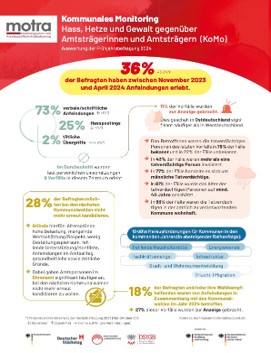 Mehr als ein Drittel der kommunalen Amtsträger*innen erleben wegen ihrer politischen Aufgabe Anfeindungen. Das ergibt sich aus der Frühjahrsbefragung 2024 der Kommunalen Monitoringstelle (Motra), deren Ergebnisse kürzlich veröffentlicht wurden. Seit Mai 2021 werden regelmäßig ehren- und hauptamtliche (Ober-) Bürgermeister*innen und Landrät*innen befragt.