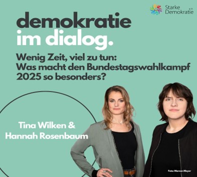 - Wie erleben Kandidierende den Bundestagswahlkampf – und was erleben sie? Welche Herausforderungen begegnen ihnen im Kontakt mit Wählenden? Und wie gehen sie mit Anfeindungen und Hass um? Tina Wilken und Hannah Rosenbaum, die für die Grünen in Dortmund für ein Bundestagsmandat kandidierten, sprechen mit Julia Jannaschk und Lisa Küsters von Starke Demokratie. Sie schildern, wie unterschiedlich Wählende auf sie reagieren – von großem Zuspruch bis hin zu Hassbotschaften und verbalen sowie physischen Angriffen und warum es trotz aller Herausforderungen wichtiger denn je ist, sich politisch zu engagieren.